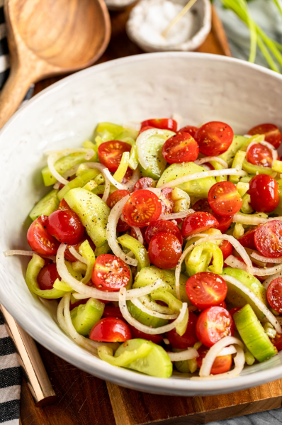 In Hungary, fresh vegetable salads are often served alongside hearty stews, roasts, or fried meats. Paradicsomsaláta (Hungarian Marinated Tomato Salad) is a classic — juicy tomatoes in a tangy-sweet paprika dressing, sometimes with onions and fresh herbs. It’s quick, refreshing, and tastes like the Hungarian countryside. 🌿