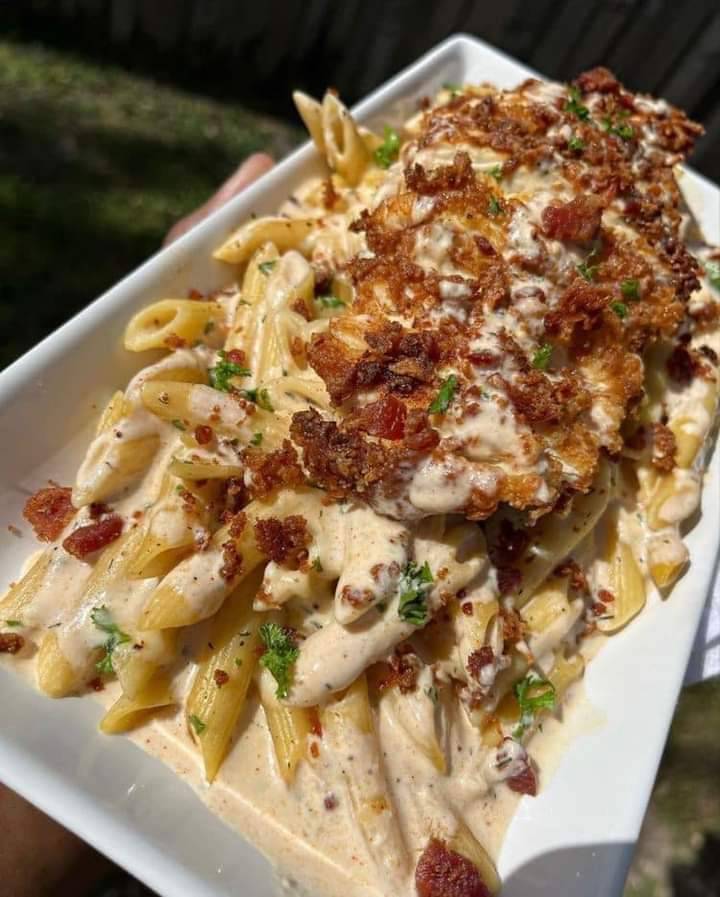 Your Cheddar Bacon Ranch Chicken Alfredo Pasta is ready to serve! It’s a comforting and hearty dish that’s sure to please everyone at the table. Enjoy!