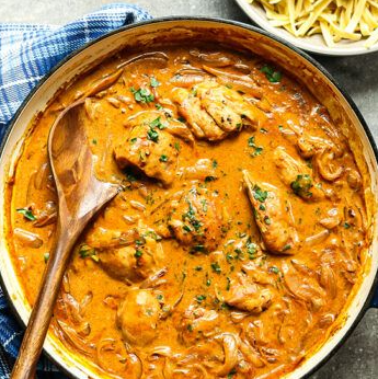 Remove from heat briefly (to prevent burning), stir in paprika, then return to heat. - Add chicken: