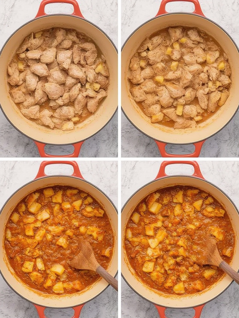 Return chicken to the pan and add potato chunks. Pour in chicken broth, then bring to a boil. Reduce heat to low, cover, and simmer for 30 minutes, or until potatoes are tender and chicken reaches 165°F internally.